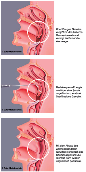 Radiofrequenz induziert eine Volumenverkleinerung durch sogenannte "Läsionen", die unter der Schleimhaut gesetzt werden und dadurch eine Vernarbung verursachen, die das Gewebe straffen und die Atemwege offen halten.